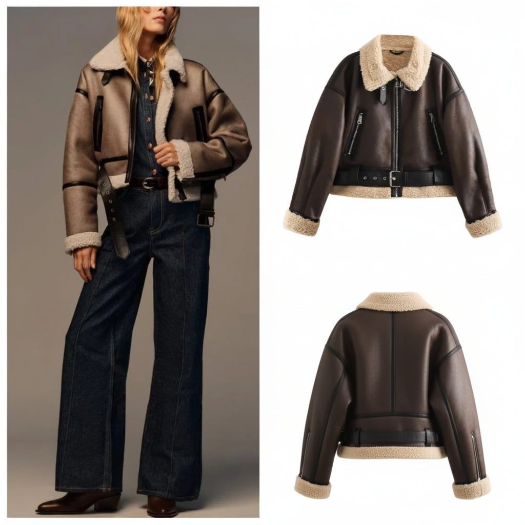 O forro shearling macio mantém você aquecida sem peso, enquanto o couro sintético de alta qualidade garante caimento estruturado e visual marcante.